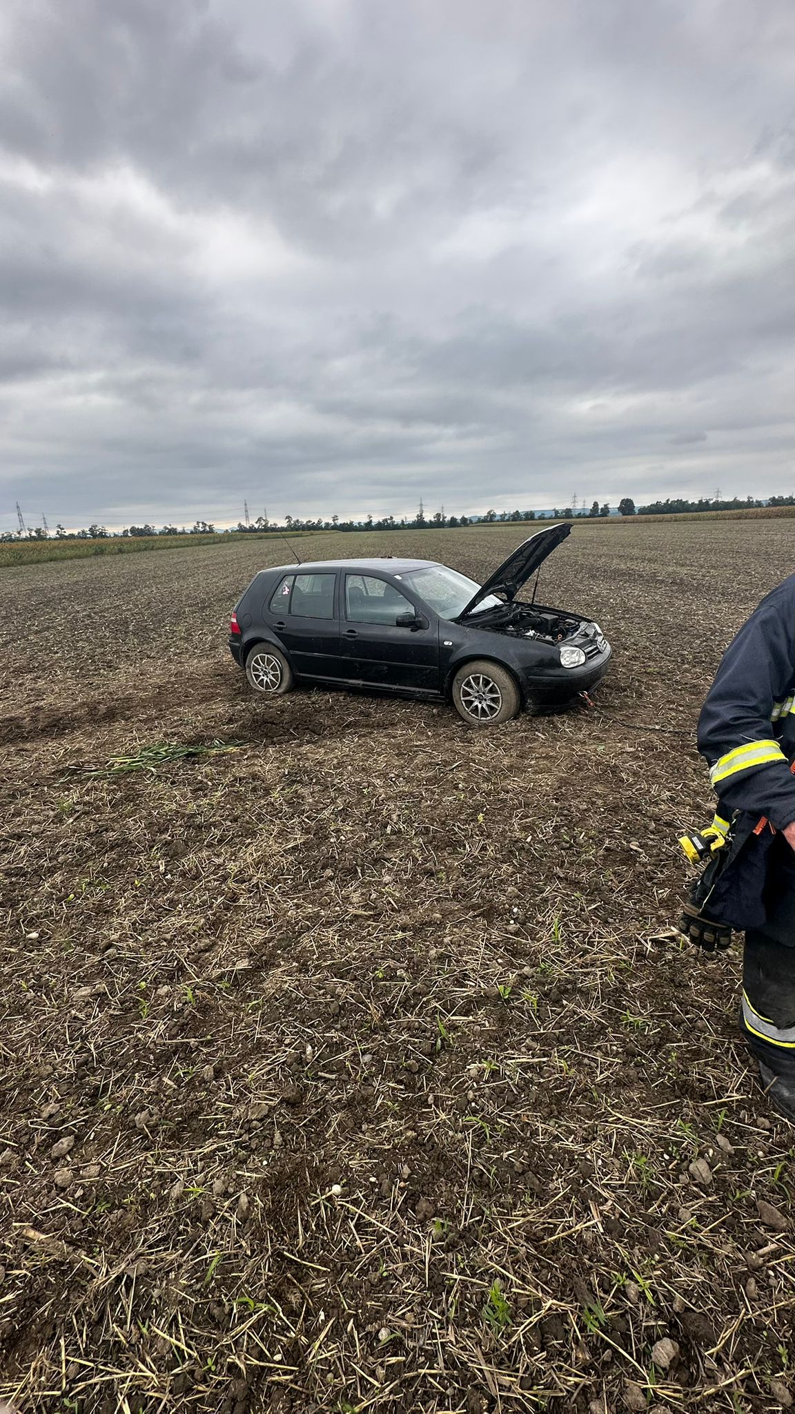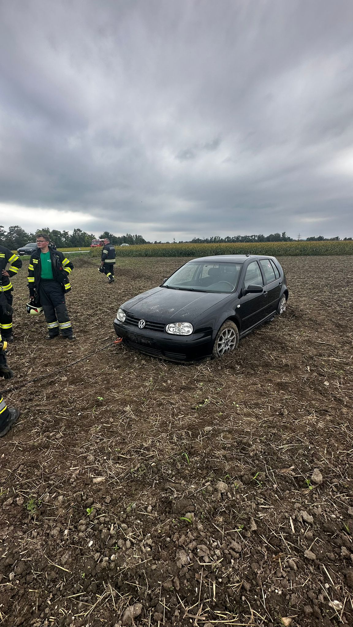 Unterstützung des Abschleppdienstes: Wir befestigten eine Verlängerung mittels Kette an der Abschleppvorrichtung, damit das Fahrzeug einfacher aus dem Acker gezogen werden konnte