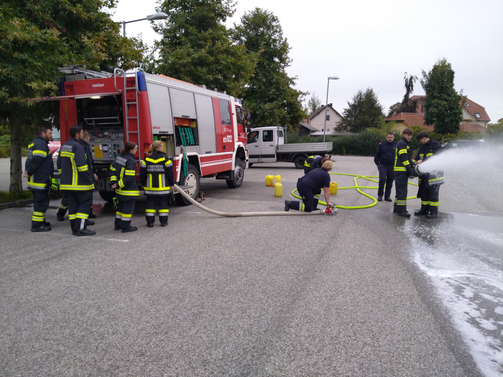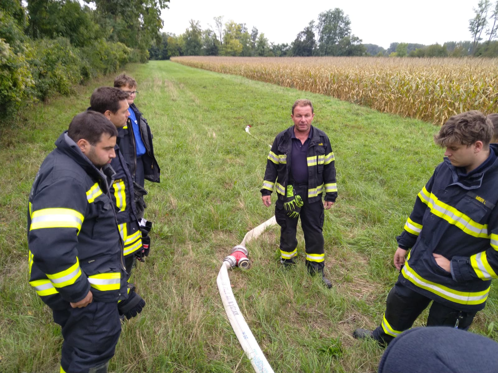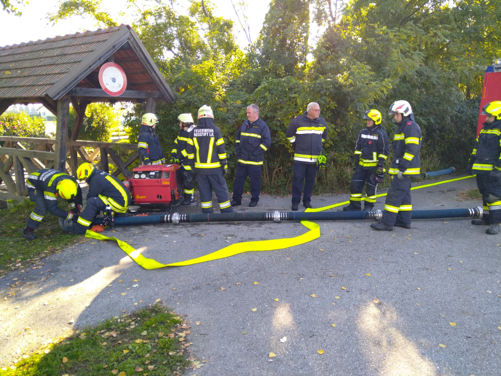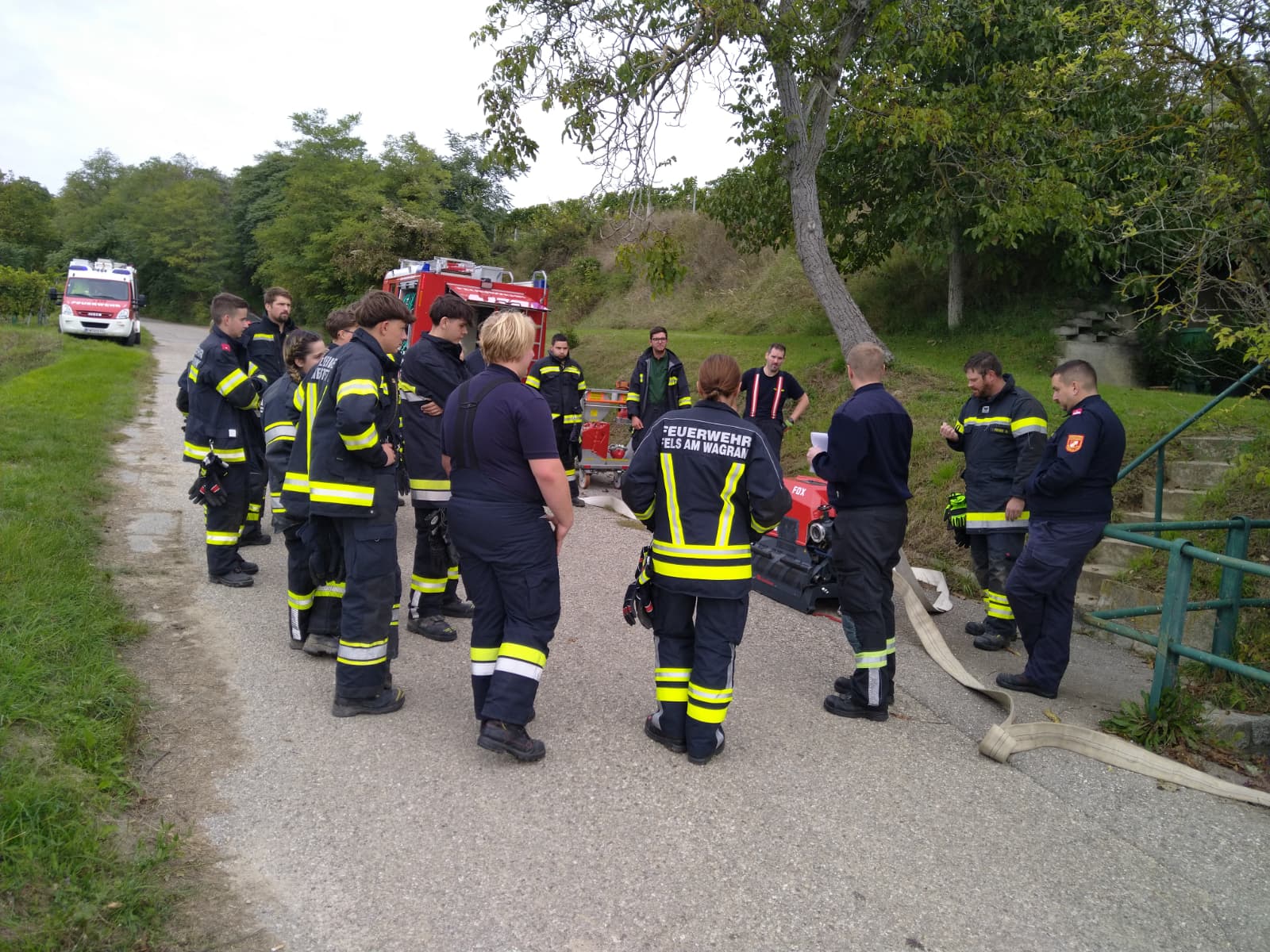 Ein besonderer Schwerpunkt war eine gemeinsame Übung in der Feuersbrunner Kellergasse, bei der eine mehrere hundert Meter lange Schlauchleitung über eine Steigung verlegt wurde – ideal, um die zuvor erlernten Berechnungen in die Praxis umzusetzen.