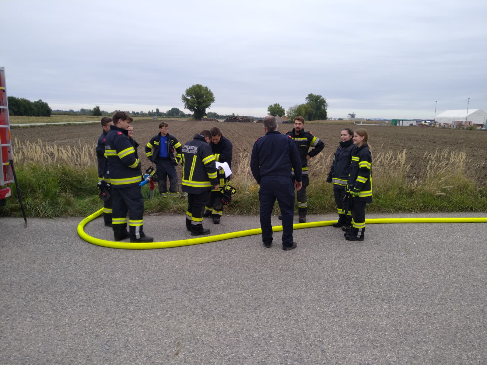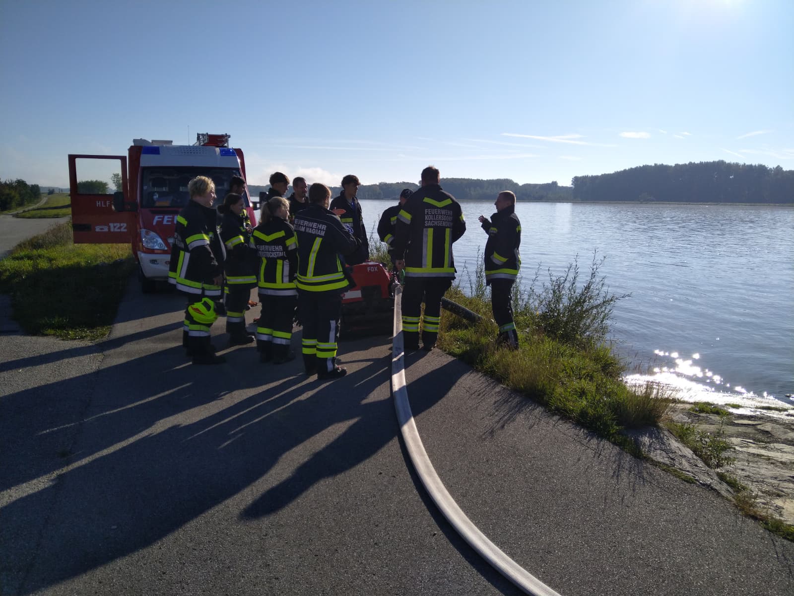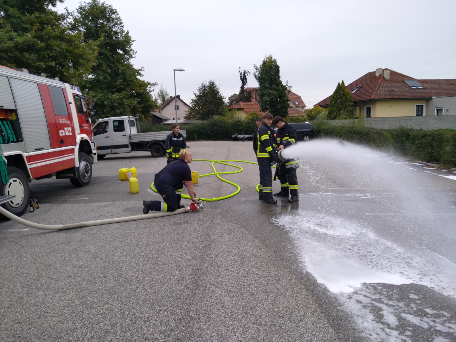 Ein besonderer Schwerpunkt war eine gemeinsame Übung in der Feuersbrunner Kellergasse, bei der eine mehrere hundert Meter lange Schlauchleitung über eine Steigung verlegt wurde – ideal, um die zuvor erlernten Berechnungen in die Praxis umzusetzen.